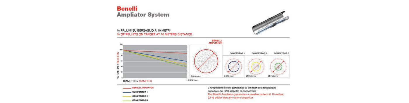 Il semiautomatico per gli amanti della caccia alla regina del bosco monta uno speciale strozzatore dispersante, chiamato Ampliator System. Il nuovo ampliatore è utilizzato indifferentemente sia con cartucce dotate di bicchierino che con caricamenti tradizionali o bior. L'effetto dispersante è il medesimo, con qualsiasi tipo di cartuccia e le rosate sono sempre omogenee e guarnite. L' ampliatore è stato completamente progettato dagli ingegneri Benelli. Sottoposto a test balistici utilizzando le più sofisticate tecnologie, ha garantito risultati sorprendenti: l'Ampliator System Benelli incrementa le prestazioni di oltre il 32%.